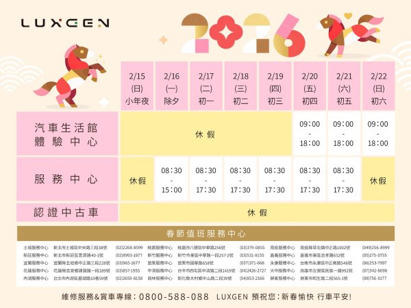 LUXGEN 始終以車主需求為核心,無論平日或年節假期,皆致力提供穩定、即時的服務品質。春節期間如需維修諮詢或緊急協助,歡迎撥打24小時客服專線 0800-588-088,由專人為您服務。LUXGEN 誠摯祝福所有車主與家人新春愉快、行車平安,在2026 年開啟更多安心、智慧、充滿幸福的移動旅程。