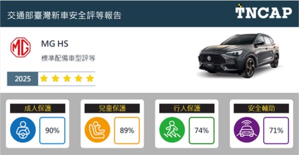 而在年節出遊時期,一向重視安全的MG,全車系標配Level 2智駕系統 & 360環景影像,行車安全輔助滿配,讓全家安心又輕鬆;而MG HS 1.5T旗艦版,在2025年更獲得TNCAP實車撞擊測試最高五星安全評價,成人保護、兒童保護都獲得極高分,就連對車外的行人也都保護有加!無怪乎MG HS上市三年,即已獲破萬車主肯定。