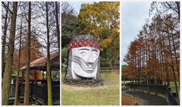 雖然東湖樂活公園入口栽植了一些落羽松,但是故宮隔壁的「原住民文化主題公園」才是2026開年大台北地區最夯的落羽松景點!和前面兩個景點都有著「鄰近市區」、「開車前往有公立停車場」、「搭大眾交通工具可達」,且「入園免費」的共通特色。開車前往原住民文化主題公園可停在故宮對面的「故宮廣場汽車停車場」,因為「原住民文化主題公園」就在故宮隔壁,走路一下子就能抵達。公園本身也不算很大,入內後走一小段路即能望見一整排沿著湖畔種植的高大落羽松,走到湖對岸,碧綠湖面倒映著艷紅落羽松的景色尤其唯美!