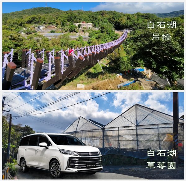不過,既然要採草莓,更適合三代同堂一起去,因此擁有大七人座的MG G50 PLUS也是非常適合如此闔家出遊的幸福馬車。儘管前往白石湖的山路,相當狹窄很難停車,而歸功於MG全系列「標配即滿配」的核心安全策略,不僅因標配有360環景,更因G50 PLUS迴轉半徑相較其他正七人座小,讓山路不再難走、停車也更輕鬆方便,讓常見的煩惱都不再是駕馭正七人座、享受多代同樂的MG G50 PLUS出遊需要煩惱的事情。當然,對如小巴、遊覽車等也有省心省事的方案,就是把導航目的地設定為與白石湖隔著山谷遙遙相望的碧山巖;該處有個佔地廣大的停車場,通過吊橋就可以走到白石湖。