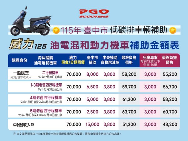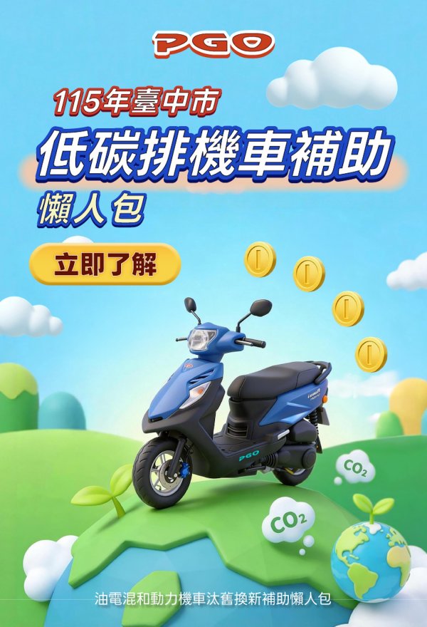 隨著115年臺中市推動低碳排車輛補助政策,油電混合動力機車入手門檻進一步降低。符合資格的民眾,透過汰舊換新、中央補助與兒童專案加碼,購買PGO威力125最低可48,200元入手,讓油電車從過去的節能選擇,轉變為更具可負擔性的日常通勤工具,最適合通勤族、家庭用車與汰換老舊機車族群。